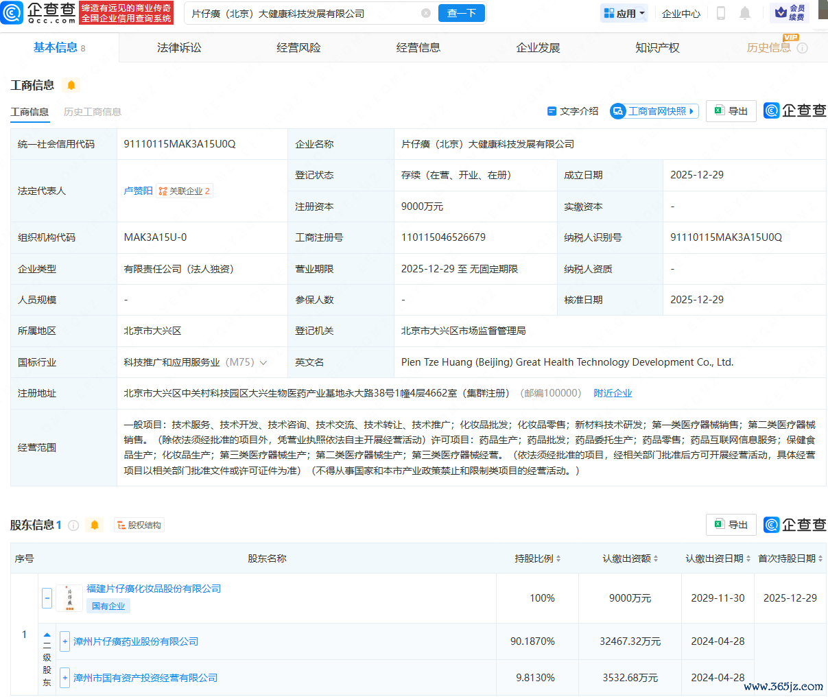 近日,片仔癀(北京)大健康科技发展有限公司成立,法定代表人为卢赞阳,注册资本为9000万元,经营范围包含:化妆品批发;化妆品零售;新材料技术研发;第一类医疗器械销售;第二类医疗器械销售等。企查查股权穿透显示,该公司由片仔癀(600436)旗下福建片仔癀化妆品股份有限公司全资持股。