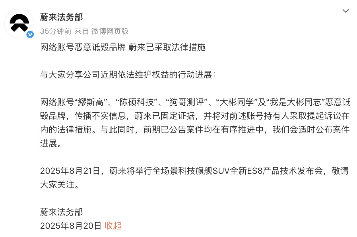 举报 第一财经广告合作,请点击这里此内容为第一财经原创,著作权归第一财经所有。未经第一财经书面授权,不得以任何方式加以使用,包括转载、摘编、复制或建立镜像。第一财经保留追究侵权者法律责任的权利。如需获得授权请联系第一财经版权部:banquan@yicai.com 相关阅读蔚来法务部:网络账号恶意诋毁品牌 已采取法律措施