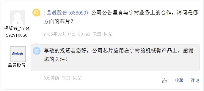 16 08-18 08:07晶晨股份:公司芯片应用在宇树的机械臂产品上